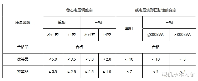 表2交流同步发电机稳态电压调整率、线电压波形正弦性畸变率分级要求